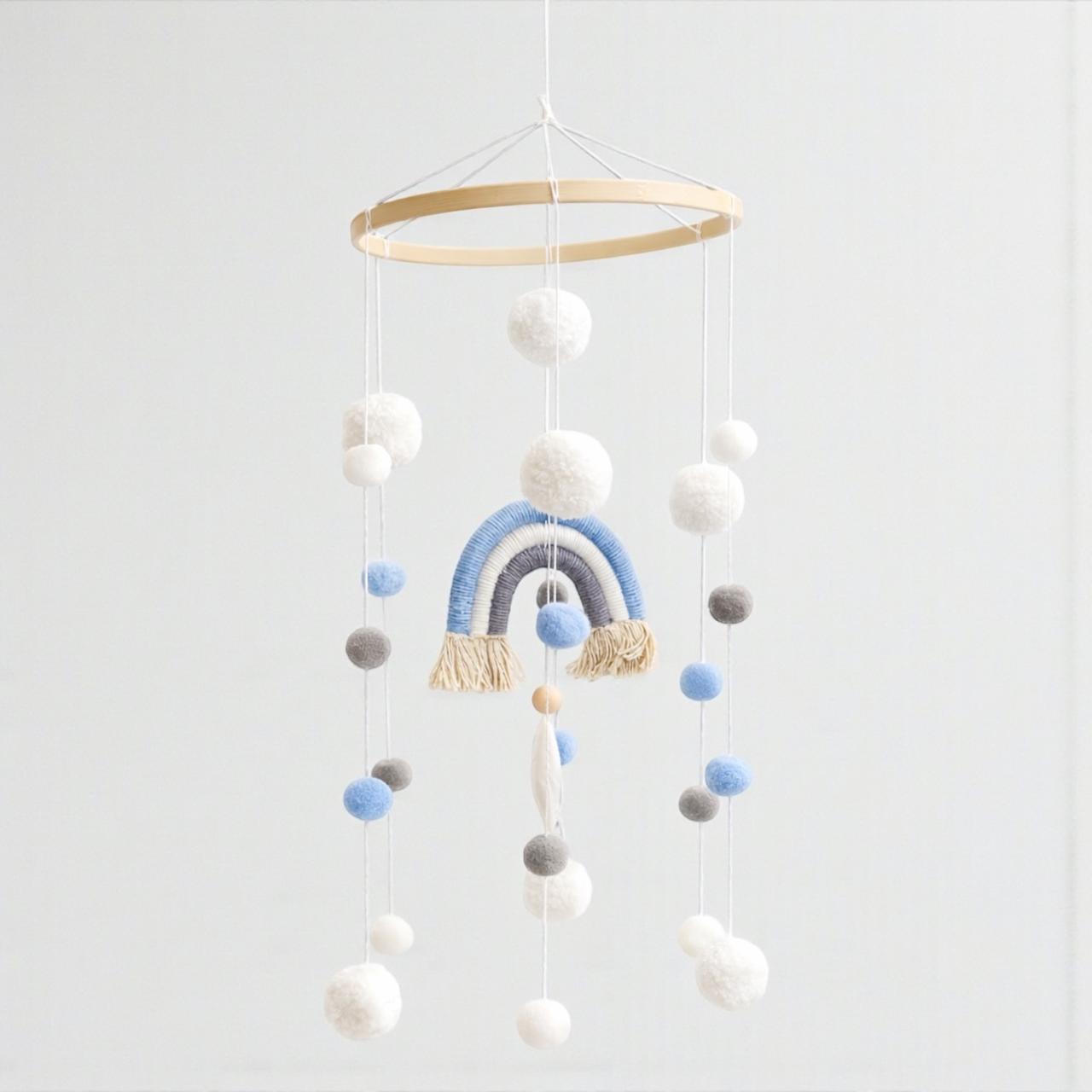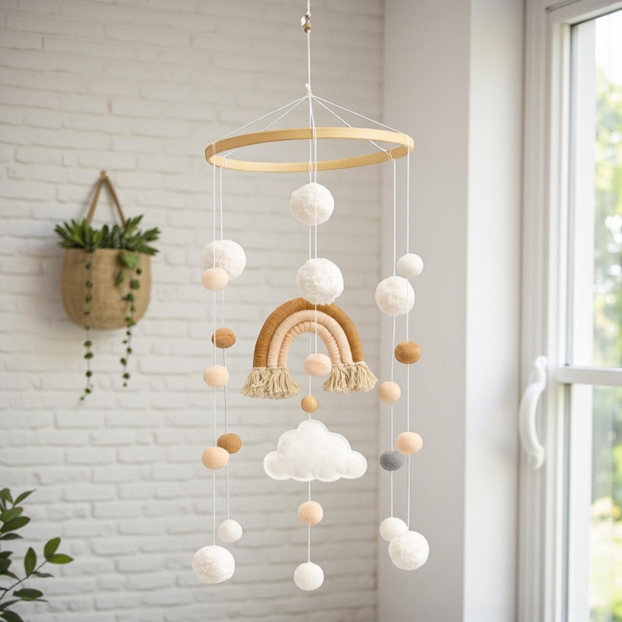 Rainbow Cot Mobile with macramé detailing brings handcrafted elegance to your nursery. Each piece features natural fiber construction with carefully suspended elements designed to captivate and soothe your infant. The gentle movement encourages visual development while the soft, neutral tones complement any room aesthetic. Lightweight and securely mounted, this mobile combines traditional craftsmanship with modern safety standards. Perfect for creating a calming sleep environment that grows with your child.